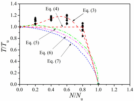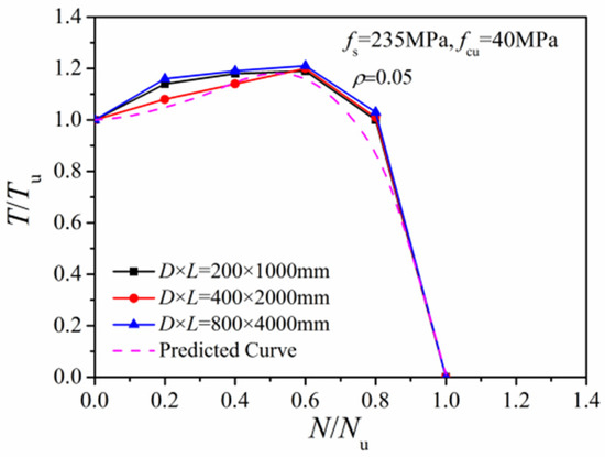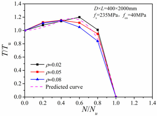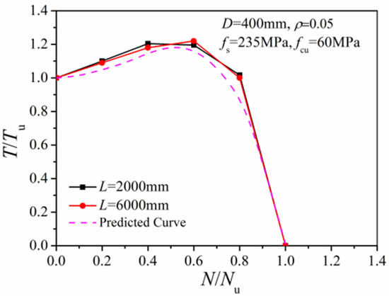 where Tu and Nu can be calculated according to Equations (1) and (2), respectively. To improve the practicability of Equation (3), it can be further simplified in favor of safety. The torsional ultimate bearing capacity of the circular CFST column at different axial compression ratios can be simplified as: