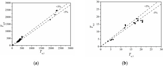 Figure 15 gives the comparison of 36 FE values (Tu,0) and 20 test values (Tu,c) with corresponding calculated values (Tu,1) using Equation (3). The average value of Tu,1/Tu,0 ratio was 1.001, and the variation coefficient was 0.093. The average value of Tu,c/Nu,1 ratio was 1.001, and the variation coefficient was 0.132. The comparisons verify the effectiveness and accuracy of the proposed formulas.