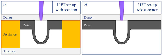 LIFT setup for the transference of high-viscosity pastes with an acceptor at a gap set by a polyimide tape (a) and without acceptor (b).