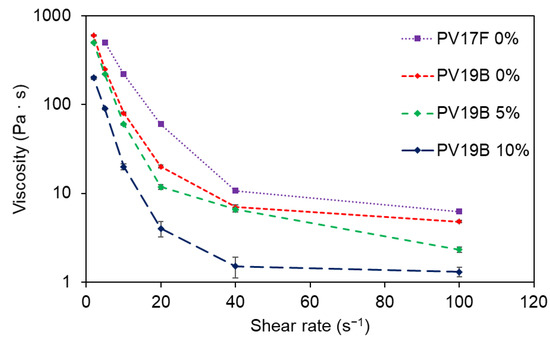 To characterize the rheological properties of the pastes, a Brookfield DV-II+ (Brookfield Engineering Laboratories Inc., Stoughton, MA, USA) viscosimeter was used. These pastes exhibited a remarkably non-Newtonian behavior, as shown in Figure 2. LIFT processes induce an extremely high shear rate, so the viscosities drop far below the values specified in the datasheet (280–400 Pa·s at 10 rpm for PV17F, and 130–250 Pa·s at 20 rpm for PV19B). This behavior is explained rheologically and not thermally, because the amount of vaporized paste is very small, and the heat conduction takes place at a slower time scale than the material transference [12]. Provided that they are not homogeneous materials but a suspension of particles, there is a wide range for the given viscosity. The study of the viscosity for both pastes considering different organic solvent proportions reports the data as shown in Figure 2. In the figure, the solvent percentage expresses the relative quantity of organic solvent that has been added to the commercial paste. In each paste, the solids content is around 90% of the total weight of the paste. The viscosity values on the technical sheets stand for low-shear-rate values at the specified revolutions per minute. The measured viscosity values, searching for the infinite viscosity, are far below the values in the technical datasheets.