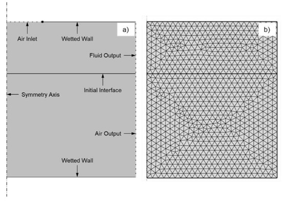 An axisymmetric FEM CFD model was built in COMSOL Multiphysics® 5.3a (COMSOL AB, Stockholm, Sweden) [15] to simulate the process. This symmetry condition eliminates some asymmetrical observed effects that differ from the ideal conditions, such as radial paste ruptures or setting the surfaces unevenly. A Phase-Field method was chosen to track the fluid interface. In the COMSOL Multiphysics® definition of the method [15], Φ, the auxiliary function to follow the interface, varied between −1 (fluid) and 1 (air), so the interface could be interpreted as centered around 0. Despite high-viscosity pastes not being sorted as fluids, the motion of each phase in the model is ruled by the continuity equation for the incompressible flow (Equation (1)) and momentum equation (Equation (2)), derived from Navier-Stokes Equations [16,17,18,19].