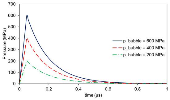 As the pressure model supposes only the interaction between the laser and the material and not the further expansion of the paste, the decays due to its movement and the thermal cooling should also be considered. The superposition of the obtained curve with the pressure decays leads to the pressure inlet function shown in Figure 4, taken as only being dependent on the pressure peak value. This peak value was estimated by observing the behavior of the paste and was not derived from the physical calculus under the model considerations. In the model, this piecewise function, defined as in Equation (13), was used as the only input, keeping the shape, and only varying the pressure peak value, pbubble. The maximum in time occurred at 0.05 μs—defined as tmax—after a step-like function was defined, only for the smooth the transition between zero and pressure peak. The quickness of the decay could be adjusted by modifying τ.