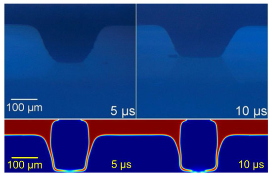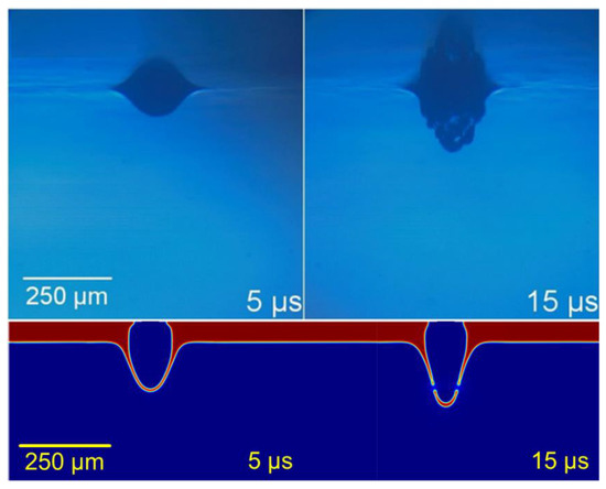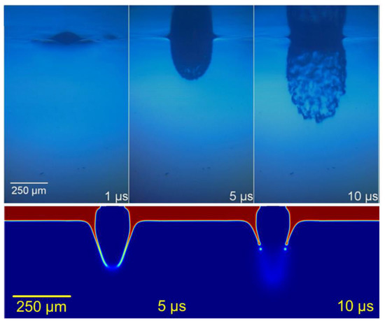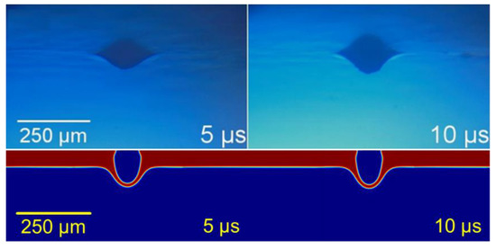 In the model, the motion of the paste is caused by an inflow of air characterized by its pressure value—instead of a generation of a vaporized high-pressure area due to the interaction laser pulse-paste, as it happens experimentally. The analysis of the results in this work is given in terms of pressure, though this parameter is not typically used in LIFT studies, rather the laser pulse energy—either expressed in terms of irradiance, absolute energy, or fluence. Nevertheless, this relation between pressure and energy has been studied for confined interaction processes [22]. Considering that the pressure is proportional to the squared root of the laser irradiance, and applying the laser parameters to these approximations, the obtained pressure values are around hundreds of megapascals, which fits in the magnitude order of the values employed to simulate this sort of LIFT process. The movement of the paste is induced by an inflow of air on the top of the model that represents the vaporization due to the interaction between the laser pulse and the paste (Figure 3). Pressure evolution thus needs to be described as the model input. For this purpose, the pressure value has been estimated from the effects on the paste structures and from its comparison with the time-resolved images.