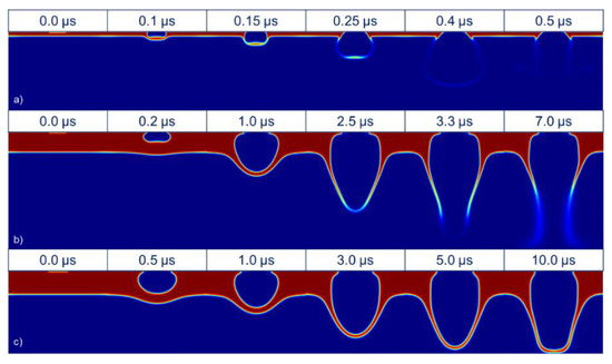 Explosive regime (a) simulation of a 2 Pa·s paste for a low thickness (12 μm) with a bubble pressure of 300 MPa, (b) simulation of 2 Pa·s paste for intermediate thickness (60 μm) with a bubble pressure of 500 MPa, and columnar regime, and (c) simulation of 2 Pa·s paste for intermediate thickness (60 μm) with a bubble pressure of 400 MPa and a gap of 160 μm.