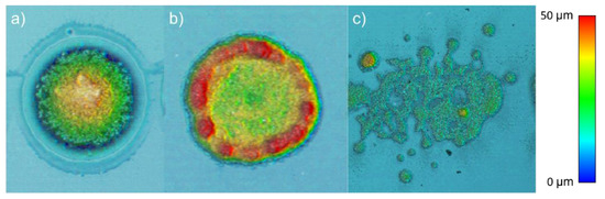 Experimentally, low values of energy did not cause the transference of the paste. Over the threshold, the paste first touched the acceptor in the shape of a dot, as in Figure 9c. An example of this transference is shown in Figure 10a. When the pulse energy was higher, the column grew wider, with a much bigger hollow cavity inside, as in the simulation in Figure 8, which led to a crowned dot (Figure 10b). The explosive regime, modeled in Figure 9a,b, led to spray structures (Figure 10c).
