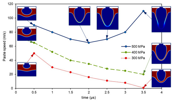 In Figure 11, the average speed of the paste over the symmetry axis (r = 0) is plotted for three different pressures. The analysis of the simulations for the cases without an acceptor substrate in which the paste did not burst led to a common speed pattern: the paste and the air inside the bubble slowed down as the expansion happened. When the structure broke up, the new behavior was pointed out: the cohesive forces of the paste did not beat the inertial ones, so the fluid throttled up again and burst into a paste spray, as seen in Figure 11 (500 MPa, blue solid line). On the contrary, lower values of pressure were not enough to break the paste, and it slowed down until it stopped (Figure 11, 400 and 300 MPa, red dashed and green dotted lines, respectively). These phenomena have already been observed by direct image acquisition [13].
