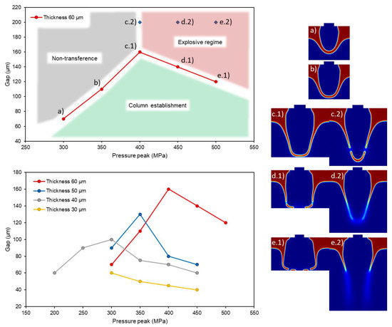 Given the paste thickness (60 μm in Figure 12, upper chart), there are three distinguishable regimes, where the dots represent the extreme cases of columnar structures (maximum distance before stopping (a and b) and maximum distance for preventing the burst (c, d, and e) depending on the case). Considering a fixed gap, the formation of a column only occurred in a range of pressures. If the pulse was not intense enough, the paste did not touch the acceptor and the transference did not take place (non-transference regime). On the contrary, over a maximum value, the column formed but the pressure inside was high enough to make it burst and spray onto the acceptor. For even greater values, the column did not even form, and just the spray travelled towards the acceptor (explosive regime). When the substrates were too spaced, there were no conditions for the paste to stretch and touch without breaking, so the transference process can be considered “without acceptor”, as it did not influence the dynamics of the paste. This study was done by varying the thickness of the paste, and it was then observed that the thinner the paste film, the lower the value of pressure to make the paste burst. In Figure 12, lower chart, 30 μm thickness line (yellow solid line), the apex is not even simulated in this work.