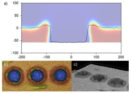 In addition, apart from the different transference regimes, several phenomena can be explained through the proposed model. For instance, the transference sets a hollow annular bulge morphology in the donor due to the emptying of the donor layer, as observed in the model. The paste does not flow back and refills the hollow dot because of its high viscosity. The comparison is shown in Figure 13, along with a profile measurement, a top-view, and a 3D view acquired through confocal microscopy.