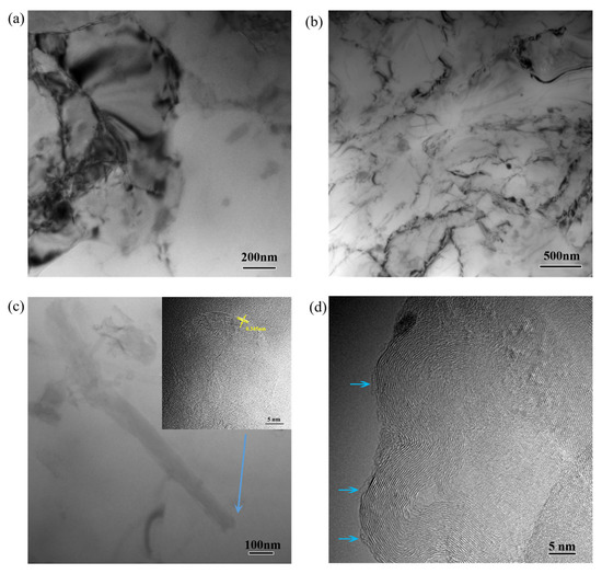 The typical TEM images of Al/1.0 vol.% CNTs nanocomposites processed over 12 ARB cycles are shown in Figure 3. Typical substructures (Figure 3a) and deformed structures (Figure 3b) were found in the composite. For the deformed structures, lots of aggregative dislocations were found to be in the form of dislocation networks. Figure 3c,d shows the CNTs distribution in the composite. The CNTs were found to be singly dispersed in the Al grain (Figure 3c), while some CNT clusters were distributed along the grain boundaries (as shown by the black arrow in Figure 3d). The interlayer spacing of CNTs, calculated by using a Digital Micrograph, was 0.345 nm, consistent with the ideal graphitic interlayer space (0.34 nm). The distribution of CNTs at the grain boundaries exerted an effective pinning on the grain boundaries, contributing to the generation of many dislocations in the composites.