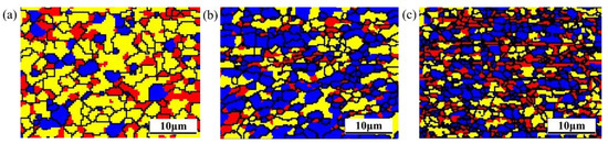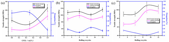 The rolling cycles with a high degree of recrystallization has a significant decrease in strength. On the contrary, the strength of the material with fewer cycles is lower. Additionally, the substructured grain frequency (shown in Figure 6) decreases with the increasing content of CNTs, and the work-hardening effect caused by substructured grains outweighs the texture softening effect. The recrystallized, substructured and deformed frequency of pure Al hot-rolled for 12 cycles was 14%, 61% and 25%, respectively. Meanwhile, those of Al/0.5 vol.% CNTs and Al/1.0 vol.% CNTs hot-rolled 12 cycles was 48%, 38%, 14% and 40%, 29%, 31%, respectively. The strengthening effect caused by the dispersion of CNTs and deformation, and the variation of the deformed grain frequency shown in Figure 6 has a consistent trend with the strength in Figure 4.