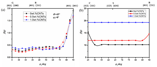 Figure 8 shows the orientation density f(g) of Al with 0.5, 1.0 vol.% CNTs. With the mass fraction of the reinforcing phase increased from 0% to 1%, the grains on the α orientation are constantly turning to {011}<011>, and the mass fractions have little influence on the orientation density. The crystal grains gather toward the β orientation line, but there is a certain degree of deviation from the standard position. The rolling texture is mainly concentrated in the vicinity of the β orientation line and the copper (C) and brass copper (B) orientations. As the mass fraction of the reinforcing phase increases, and the aggregation extent on the β orientation line escalates. As the mass fraction is increased from 0 to 0.5%, the orientation of the grains turn from C orientation to the B orientation constantly. As the mass fraction increases to 1.0%, both the C, S, and B orientations maintained at a higher density.