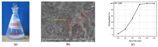 (a) The GHBs after soaking in water for three months and (b) SEM image of GHB and (c) Sieve size distribution of GHB.