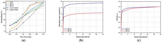 (a) Sieve size distribution of fine aggregates and (b) the variation of water content with time in RFA and (c) the variation trend of RFA water absorption after normalization treatment.