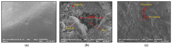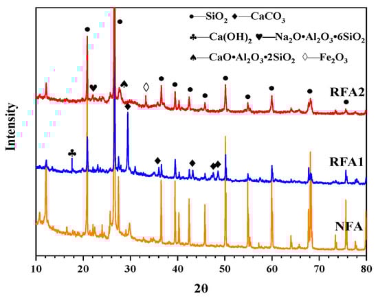 Figure 3a–c is the SEM images of NFA, RFA1 and RFA2, respectively. The surface of NFA was smooth and flat (Figure 3a), while there were obvious pores on the surface of RFA1(Figure 3b). In addition, many small particles occurred on the surface of RFA1, namely old mortar particles in waste concrete. There were distinct lines on the surface of RFA2 (Figure 3c), which should be the sintered phase produced in the sintering process of clay bricks. RFA2 had a compact surface and clear structure with only a few micro pores. Comparing Figure 3b,c shows that the surface of RFA2 was denser than that of RFA1, indicating a better quality of RFA2.