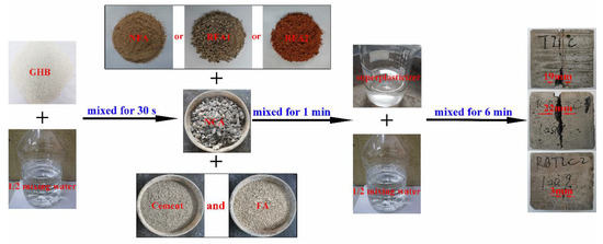 The concrete mixing method referred to the method proposed by Wang et al. [6], as shown in Figure 5. For each type of concrete mixture, twenty-four 100 × 100 × 100 mm cubes, three 150 × 150 × 300 mm prisms, three 100 × 100 × 515 mm prisms and two ϕ200 × 400 mm cylinders were prepared.