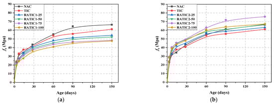 The compressive strength of RATIC at different ages: (a) RATIC1; (b) RATIC2.