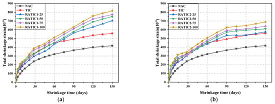 The total shrinkage curve of RATIC with time: (a) RATIC1; (b) RATIC2.