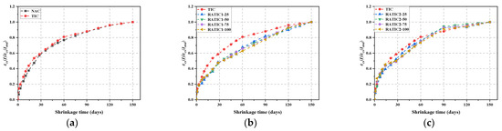 In order to compare the development of total shrinkage of RATIC, the total shrinkage strain of NAC, TIC and RATIC at different times was normalized to the final value, that is, εcs (t)/ εcs (tend), as shown in Figure 9a–c. As can be seen from Figure 9a, compared with NAC, the total shrinkage strain of TIC developed rapidly in the early stage, and the total shrinkage at 1 day and 3 days reached 14.31% and 19.86% of the total shrinkage, respectively, which were 106.3% and 36.1% higher than the corresponding total shrinkage of NAC. The main reason for this phenomenon may be the continuous progress of cement hydration, which had a compaction effect on GHBs [39]; the volume deformation of GHBs occurred to a certain extent, which could increase the total shrinkage strain of RATIC at early stage. Maghfouri et al. [22] reached similar conclusions by adding oil palm shells to concrete. As also shown in Figure 9a, GHBs had little effect on the long-term development of total shrinkage strain of TIC, which may be due to the fact that the water adsorbed on the surface of GHBs and the water in the open pores dissipated quickly.