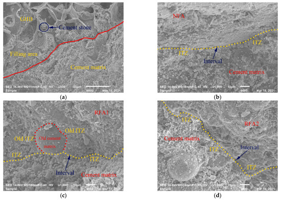 Figure 10a shows the ITZ of TIC between GHB and the cement matrix. There was an obvious filling area between the cement matrix and GHB, and part of the cement matrix filled into the open pores of GHB. Cement matrix filling might be an important reason for the higher total shrinkage strain of TIC than that of NAC in the early stage. It is generally believed that the ITZ was the weak part of concrete, and the analysis of its microstructure was beneficial to further study the performance of concrete. In Figure 10b, there was an obvious ITZ in TIC between NFA and cement matrix. Figure 10c,d show the ITZ of RATIC1 and RATIC2 between fine aggregate and cement matrix, respectively. Compared with TIC in Figure 10b, the ITZ of RATIC1 (Figure 10c) and RATIC2 (Figure 10d) were denser, which explained that the splitting tensile strength and elastic modulus of RATIC1 and RATIC2 could be improved when the RFA replacement ratio was appropriate as shown in Table 6 and Table 7. However, there were also old ITZs between the old natural aggregate and the old cement matrix in RFA1. As shown in Figure 10c, the old ITZ in RFA1 made the ITZ micromorphology more complex, and its length was larger than that of RATIC2, which resulted in worse mechanical properties of RATIC1.