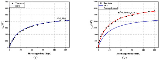 Figure 11a shows the prediction curve of NAC total shrinkage εcs based on the EC2 model, and Figure 11b is the prediction curve of TIC total shrinkage εcs,b optimized by the GHB influence factor kb on the basis of the EC2 model. As shown in Figure 11, the EC2 model can well predict the change trend of the total shrinkage of NAC, but the predicted value of the total shrinkage of TIC differs greatly from the experimental results. However, the model shown in Equation (5) can well predict the variation trend of TIC total shrinkage, indicating that the modification of the EC2 model by introducing kb is effective.