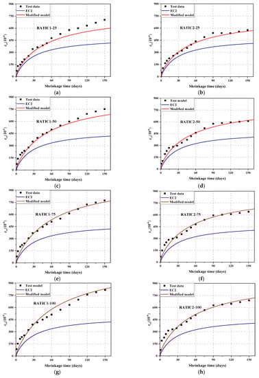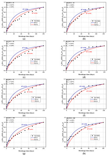 In order to express the development of the drying shrinkage strain of RATIC, the difference between the predicted value of total shrinkage strain and autogenous shrinkage strain is normalized, that is, (εcs(t)-εca,b(t))/(εcs(tend)-εca,b(tend)). β(t,t0) of the EC2 model and the modified βa(t,t0) were used to fit the normalized experimental values, as shown in Figure 12a–h. It is observed that the EC2 model with the time-dependent factor kwa is more helpful to describe the total shrinkage development of RATIC, so it is effective to modify the EC2 model with kwa.