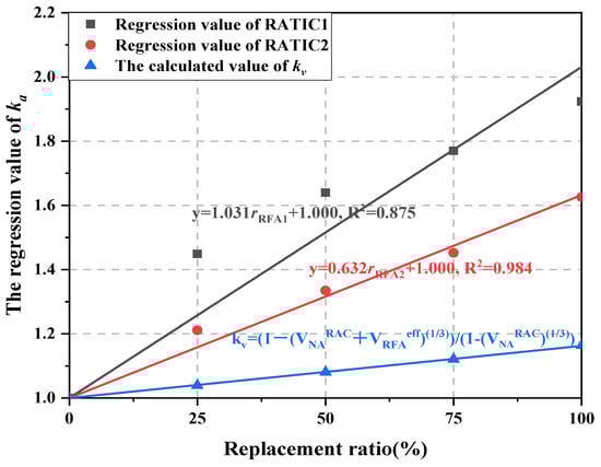It can be seen that the regression value of ka is greater than kv under the same replacement ratio. This may be because the effective volume of RFA1 and RFA2 are smaller than the experience value of Zhang et al. [21]. At the same replacement ratio, ka of RATIC1 is greater than that of RATIC2, which also indicates that the elastic modulus of RFA1 is less than that of RFA2.