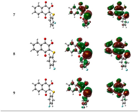 The optimized geometries, as well as HOMO and LUMO distribution for lawsone and its thio derivatives, are presented in Figure 3.