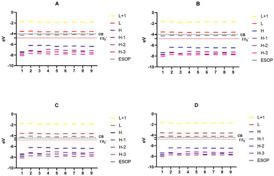 Level alignment of each compound regarding TiO2 ((A) in vacuum and (B) in methanol) and ZnO ((C) in vacuum and (D) in methanol). Alignment regarding electrolyte I−/I3− is shown in each case. Values for TiO2 and ZnO have been obtained from references [48,49].