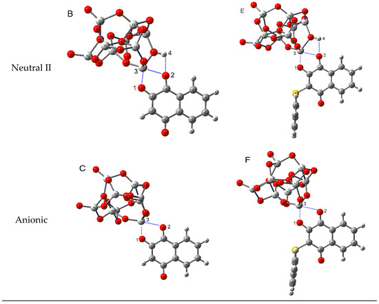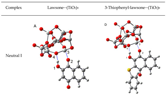 An essential requisite for an organic dye can effectively acts as a sensitizer in DSSCs, is the anchoring to the surface of the semiconductor. The latter can be achieved by incorporating different polar functional groups in the structure of sensitizer (as carboxylic acid, amines, ketones, among others). Prinzisky et al. studied the performance of a hydroxy-anthraquinone imine as a dye for DSSCs [51], where the hydroxyl and imine groups acting anchoring the molecule to the TiO2 semiconductor surface. Recently, Sreeja and Pesala studied the performance of natural dyes indigo, lawsone, and betanin as co-sensitizer for solar cells [23]. They associated one carbonyl group of the lawsone as an anchor group to the surface of TiO2. However, lawsone possesses a hydroxyl group in the alpha position to one of the carbonyls of the quinone ring, which can additionally contribute to anchoring the molecule to the surface of the semiconductor. Considering this background, we studied the interactions between lawsone and 3-thiophenyl-lawsone with a TiO2 surface model by DFT calculations. The adsorption of the dyes was simulated with a (TiO2)9 cluster, based on previous works of Sánchez de Armas et al. [52,53], who showed that a group of (TiO2)9 is large enough to reproduce adequately the electronic properties of a dye-TiO2 system. There are different ways to adsorb a dye onto a TiO2 surface, depending on the conditions used to prepare DSSC [37]. Considering the above, we explored three possible anchoring modes for both molecules, depending on the protonation state of the hydroxyl (Figure 5). The first mode corresponds to a not dissociate state of hydroxyl (neutral I), the second mode corresponds to a dissociate state, where the hydroxyl proton is transferred to an oxygen of TiO2 surface (neutral II), and the third mode corresponds to a dissociate state where the hydroxyl proton is transferred to another species with basic character, potentially present in the medium (anionic).