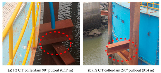 There are rubber tubes and compression-type rubber packing materials used for the cut-off. As shown in Figure 2a, the adhesive rubber tube attached to the end of the steel caisson is in close contact with the leveling concrete and creates a pressure greater than the water pressure to block the external inflow. As shown in Figure 2b, the compression-type rubber packing compresses the rubber packing attached to the bottom of the steel caisson with the caisson’s own weight, which is greater than the water pressure, to block the external inflow to the leveling concrete. In this study, a close-fitting type rubber tube C.T cofferdam was used.