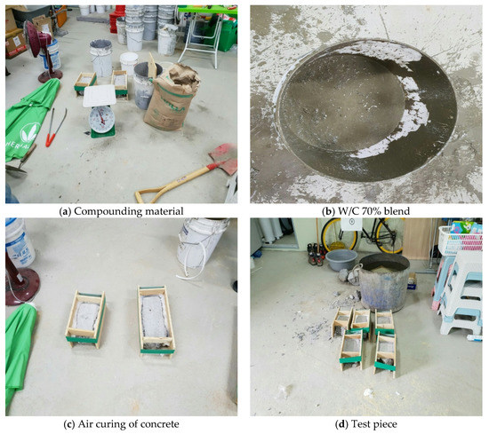 In order to apply a mixing ratio similar to the field conditions, the W/C ratio was set to 70% and grout was poured on the surface of the pile foundation, collected from the field under both air and underwater conditions, as shown in Figure 5. Similarly, a test piece was prepared.