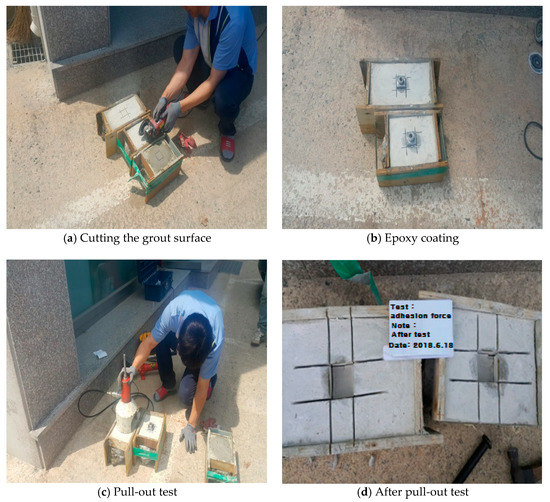 The lab test was conducted to confirm the adhesion strength of the surface of the pile foundation and grout. As shown in Figure 6a, the surface of the grout was cut into 4 cm × 4 cm sizes and the epoxy was coated on the surface of the pull-out equipment; the grout was as shown in Figure 6b. As shown in Figure 6c, the pull-out force was tested to evaluate the adhesion strength. Figure 6d is a view after the test.