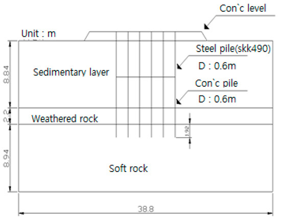 For the modeling of pre-bored piles embedded in the rock, material properties of weathered rock and soft rock, where the piles are embedded, were compared on the basis of the material properties of grout materials with a low elastic modulus, as shown Table 9.