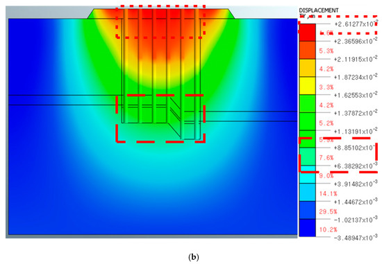 Figure 9 and Figure 10 present the analysis results and show the maximum value of the vertical displacement in each node. The pile end had the maximum displacement in the nodes, as referred to in the boxes in Figure 9 and Figure 10.