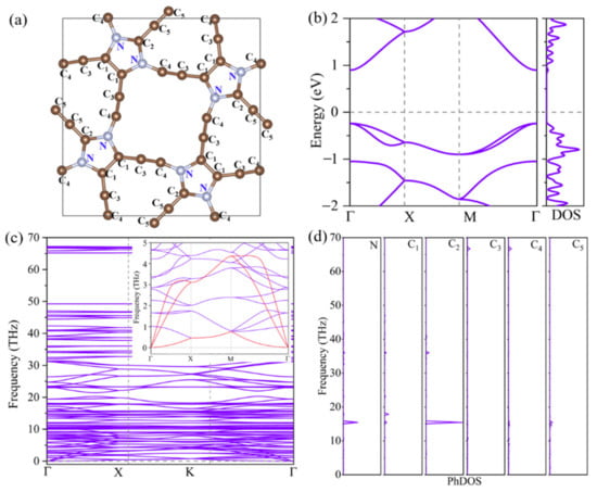 (a) Geometric structure, (b) electronic band structure, (c) phonon spectrum, and (d) partial phonon density of states (PhDOS) of ID-GY.