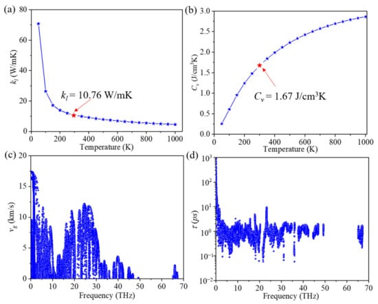 (a) Lattice thermal conductivity (kl), (b) phonon volumetric-specific heat (Cv), (c) group velocity (vg), and (d) phonon lifetime (τ) of ID-GY.