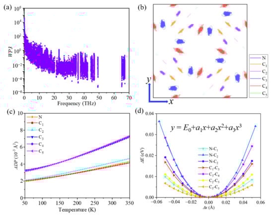 A short phonon lifetime is usually associated with strong phonon scattering. Therefore, we studied the phonon scatterings by carrying out additional calculations based on the scattering mechanism of phonon modes. Three-phonon scattering is the dominant process in the heat transport process and usually depends on two factors: the number of existing scattering channels and the strength of each scattering channel, which can be described by weighted phase space (WP3) and mode Grüneisen parameter (γ). The weighted phase space of each phonon mode with respect to phonon frequency is plotted in Figure 3a. We found that the value of the WP3 is relatively large, which results from the large number of atoms per unit cell and the complex geometric structure of ID-GY. Moreover, the Grüneisen parameter, which quantifies the intensity of anharmonic interactions between the phonon branches, is another key factor in determining the phonon lifetime of a system. The average Grüneisen parameter of ID-GY was calculated to be 1.51, which is comparable to that of traditional thermoelectric material PbTe (1.65) [40], suggesting the existence of a strong anharmonicity in ID-GY.