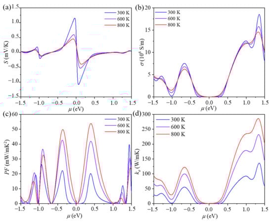 (a) Seebeck coefficient (S), (b) electrical conductivity (σ), (c) power factor (PF), and (d) electronic thermal conductivity (ke) of ID-GY as a function of chemical potential μ, respectively.
