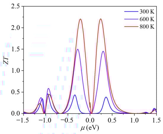 Finally, the thermoelectric performance of ID-GY was evaluated using the ZT value. The variations in our calculated ZT values with chemical potential μ at different temperatures are plotted in Figure 5. At 300 K, the optimized ZT values of ID-GY can reach 0.46 and 0.38 for p-type and n-type with the hole- and electron-doping concentrations of 5.8 × 1012 and 1.75 × 1012 cm−2, respectively, which are higher than the ZT values of many other 2D carbon materials [30], including graphene (0.01), α-graphyne (0.03), β-graphyne (0.12), γ-graphyne (0.17), and 6,6,12-graphyne (0.05). While at 800 K, the ZT values are 2.20 and 2.21 for p-type and n-type ID-GY.