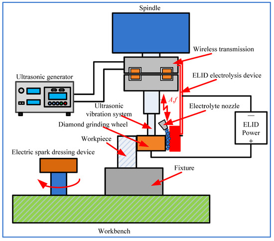 The schematic of UA-ELID grinding is depicted in Figure 1. The system mainly contains an ultrasonic vibration system, ELID power, ultrasonic cathode device, and diamond grinding wheel with cast iron bond. During the grinding, the diamond grinding wheel is selected as the anode and the copper cathode as the cathode. The ultrasonic vibration is superimposed on the grinding wheel along its axial direction. The electrolytic grinding liquid is persistently supplied during the inter-electrode gaps through an electrolyte nozzle. The UA-ELID grinding principle can be subdivided into four stages; namely, (i) grinding wheel shaping, (ii) grinding wheel pre-dressing to protrude the diamond grains on the wheel surface, (iii) dynamic grinding, and (iv) polishing. Before the processing, the dressing device of electrical discharge machining (EDM) is used to pre-dress the grinding wheel, in which the process of the bonding material (iron) is gradually corroded by the electrochemical reaction, and an oxide film is generated on the surface of the grinding wheel. When its thickness reaches a critical value, the electrochemical reaction is nearly terminated, and the oxide film thickness is no longer increased. Under the ultrasonic vibration effect, the grinding wheel vibrates, scratching the oxide film and the electrochemical reaction continues until a new balanced state is reached. In this study, the third stage (dynamic grinding) is explored to observe the cavitation effect on the processing.
