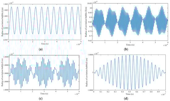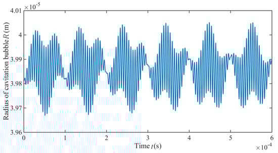 Equation (23) is solved numerically. Assuming (i = 1, 2, 3, 4), four variation patterns of the single cavitation bubble radius in the grinding zone are obtained and plotted in Figure 4. At i = 1, the cavitation bubble performs a periodic motion near the equilibrium position and is close to steady state. At i = 2, its amplitude is lower than that in the other three groups, and the vibration period is also the shortest. In cases of i = 3 and i = 4, the variation amplitude is basically consistent, while the vibration period at i = 3 is lower than that at i = 4. Therefore, the peculiar processing environment to the grinding zone plays an important part in the generation and collapse of the cavitation bubble.
