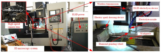 The UA-ELID grinding tests were carried out on a machining center (VMC850E) through superimposing the ultrasonic vibration system. Figure 6 presents the experimental setup, which leadingly contains the ultrasonic vibration system, the ELID power supply, a process parameter monitoring system, the EDM (electron discharge machining) dressing device, and the ELID electrolysis device. The vibration system was immobilized on the machine tool spindle with a clamp. It was composed of the ultrasonic generator, electric wireless transmission device, transducer, horn, and diamond grinding wheel. The ELID power supply mainly provided the energy for the processing and controlled some parameters. The process parameter monitoring system was utilized to observe the stability of the processing. The EDM dressing device fixed on the left side of the workbench was utilized to pre-dressing the diamond grinding wheel. The ELID electrolysis device was fixed on the spindle through the special fixture to ensure the online dressing the grinding wheel. The three-dimensional (3D) microscopy system (VW-6000, KEYENCE, Osaka, Japan) was utilized for online monitoring of the ultrasonic cavitation effect. During the observation process, a 3D microscope system and a high-speed CMOS camera was used to observe and record the cavitation process, respectively. This online system could realize online observation, slow down and magnify the monitored process, and capture the generation, movement, and collapse of bubbles on the surface of the grinding wheel.