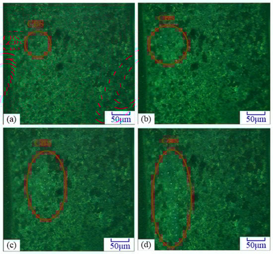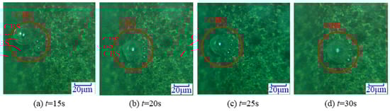 During the monitoring process, as shown in Figure 8, the variation of the CBS on the grinding wheel surface was observed under different amplitudes. It was found that both the number of CBSs on the grinding wheel surface and the radius of the cavitation bubbles increased with the ultrasonic amplitude. This can be attributed to the fact that the ultrasonic energy was positively related to the amplitude as the ultrasonic frequency kept constant. With the ultrasonic amplitude increasing, the more ultrasonic energy was absorbed by the electrolyte, and the easier ultrasonic cavitation took place on the grinding wheel surface. This was a good agreement with the results presented in the Section 2.2. In addition, the cavitation bubbles absorbed more energy from the negative ultrasonic pressure, and led to its radius increase, namely the enhanced. According to Figure 4a, the larger values indicated that the time period of cavitation closure was greatly shortened. Therefore, a stronger impact from the cavitation collapse would be observed on the grinding wheel surface at the larger amplitude.