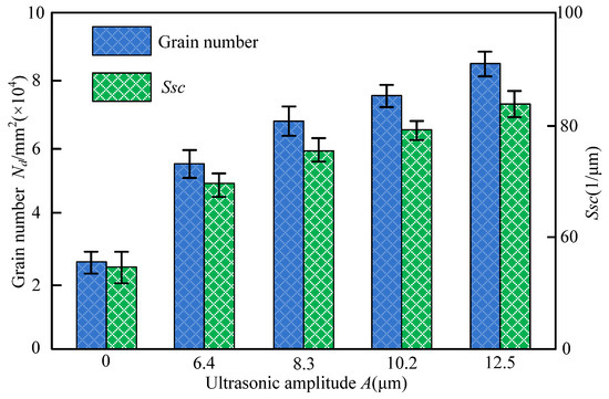 Figure 10 presented the number of grains in a unit area of 1 mm2 and Ssc under different ultrasonic amplitude, in which the ultrasonic amplitude 0 denoted the C-ELID grinding. As seen in Figure 10, the number of grains during the UA-ELID grinding was larger than that of the C-ELID grinding, and grain sharpness was improved to a certain extent. Simultaneously, with the increase of the ultrasonic amplitude, both the number of grains and their sharpness were elevated. The number of grains at higher ultrasonic amplitude was approximately twice higher than that of C-ELID grinding, and the sharpness increased by 43.2%. This explains why high-frequency ultrasonic vibration easily caused the cavitation on the grinding wheel surface and changed the mechanism of oxide film generation. Simultaneously, under the ultrasonic vibration, the higher impact from the cavitation bubble collapse would act on the grinding wheel surface, and thus the oxide film thickness declined, as compared to that of the C-ELID grinding and reduce the number of diamond grains covered by the oxide film. In addition, the cavitation effect became stronger at larger ultrasonic amplitude, increasing the instantaneous impact force. This, in turn, would enhance the effective cutting edges of diamond grains and meanwhile increased their sharpness.