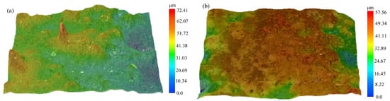 Figure 11 presents the 3D morphology of the grinding wheel surface under C-ELID and UA-ELID processing conditions. It can be seen that the grain protrusion height in the former case was higher than that in the latter one. During the C-ELID grinding, the diamond grains was buried in the oxide film, so the number of grains protruding from the grinding wheel surface was lower than in UA-ELID, but the maximum protrusion height of grains was larger. Under the UA-ELID grinding, the higher vibration can lead to the oxide film detachment from the grinding wheel surface, and provide its dressing, which would decrease the maximum protrusion height and grain spacing [25]. Besides the online dressing, the UA-ELID grinding combines the high-frequency ultrasonic vibration with the cavitation effect, which jointly enhanced the oxide film removal. Therefore, the oxide film on the grinding wheel surface was relatively thinner, and the relative number of grains was larger in UA-ELID than in C-ELID grinding.