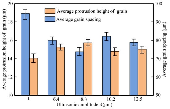 The dressing effect of the grinding wheel during both conditions is presented in Figure 12. It was observed from Figure 12 that the average protrusion height of grains during the UA-ELID grinding was exceeded that in the C-ELID grinding by 14.2%. However, the average grain spacing in the former case was lower than that in the latter by 21.2%. This can be attributed to the fact that the ultrasonic vibration could decline the oxide film thickness on the grinding wheel, which was conducive to enhance the average protruding height of grains. In addition, the ultrasonic vibration could improve the maximum grinding force, and it was beneficial to damage the grains and forming new cutting edges. The joint action of these factors implies the above effect on the average protrusion height of grains. Insofar as the number of grains per unit area in the UA-ELID grinding was larger than that in the C-ELID, the average grain spacing in the former case was lower, respectively. As the ultrasonic amplitude increased, the ultrasonic cavitation was intensified, as well as its action on grains, which exerted a significant effect on the grinding wheel surface.