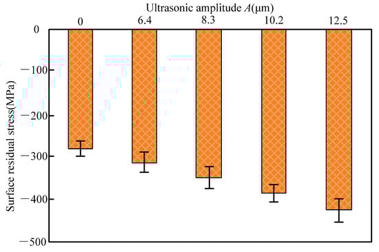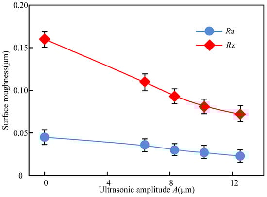 The surface roughness of the workpiece under both processing was shown in Figure 13. It can be seen from the Figure 13 that the surface roughness decreased with the ultrasonic amplitude increasing. Compared with the C-ELID grinding, the surface roughness parameters of Rz and Ra maximum dropped by 54.2% and 46.5%, respectively, during the UA-ELID grinding, which was the reason that the increase of ultrasonic amplitude strengthened the ultrasonic cavitation, and its action on the grinding wheel surface became more uniform. When the ultrasonic amplitude increased, the micro-jet induced by the rapid generation and collapse of cavitation bubbles would exhibit a scouring effect on the grinding wheel surface. At the same time, the motion path of diamond grains was also changed, and the average grinding force was reduced at higher amplitude. This would result in surface roughness decline and surface quality improvement.