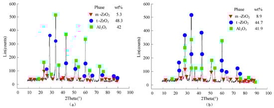 The surface morphology under different ultrasonic amplitude was presented in the Figure 14. The grooves on the surface processed by C-ELID grinding were more pronounced, while the surface was getting gradually smoother with the ultrasonic amplitude increasing. It was demonstrated that the materials removal occurred by plastic deformation under the ultrasonic vibration. The XRD scanning was utilized to observe the workpiece surface under different ultrasonic amplitude. The results of different ultrasonic amplitude were respectively presented in Figure 15. As presented in Figure 15, the ZTA ceramics underwent the martensite transformation, in which t-ZrO2 particles transformed to m-ZrO2 particles with the help of ultrasonic vibration. In addition, 3.6% of t-ZrO2 particles took part in the transformation, which led to the volume expansion by 3–5%. In other words, during the UA-ELID grinding, the material removal was changed to a certain extent. According to Tong et al. [32], the characteristics of nanocomposite ceramic were changed by the vibration induced stress. During the ultrasonic vibration, the high internal vibration-induced stress significantly reduced the equivalent hardness and softened the surface layer. As shown in Figure 15, the number of micro pits on the workpiece surface gradually augmented with an increase in ultrasonic amplitude. These results indicated that the ultrasonic cavitation induced a high instantaneous impact force on the surface. The higher ultrasonic amplitude was applied to the surface, the more uniform is the distribution of micro pits on the surface. This also manifested that the ultrasonic cavitation erected a significant effect on the mechanism of material removal.