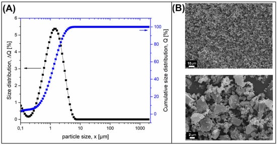 The biochar (BioC) filler used during this study was purchased from the company Fluid SA. For this particular type of BioC, the pyrolysis process was conducted at 650 °C, while the material itself was prepared on the basis of wood chips. The mean particle size in the untreated BioC was around 200 µm. Before the introduction to the polyol, the BioC filler was ball-milled for 24 h. The milling procedure reduces the average particle size. The size analysis, performed with the use of a laser particle sizer (Fritsch Analysette 22), indicates that the mean particle size is 1.5 µm, while 80% of the particles are within the size range from 0.18 to 3.5 µm. The chart presented in the Figure 1A collates the particle size distribution plots and cumulative size distribution plots. The appearance of the BioC particles after ball milling is presented in Figure 1B.