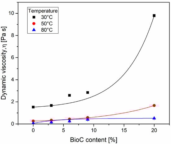 The results of the constant shear measurement are presented in Figure 3. The dynamic viscosity values were plotted in the graph. The results for individual measurement temperatures were highlighted with separate colors. The horizontal axis corresponds to the BioC content in the final product, while the actual content in the premix is higher, as shown in Table 1.